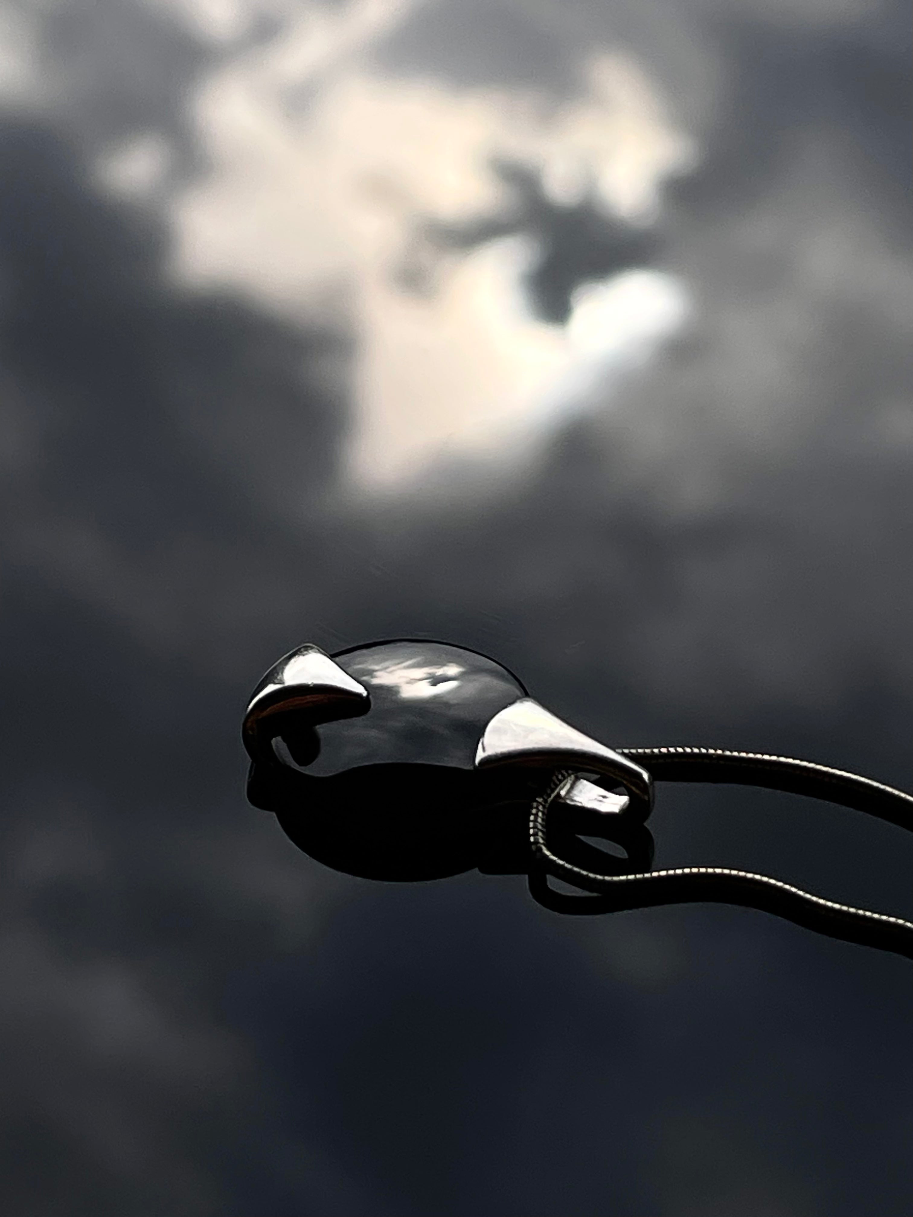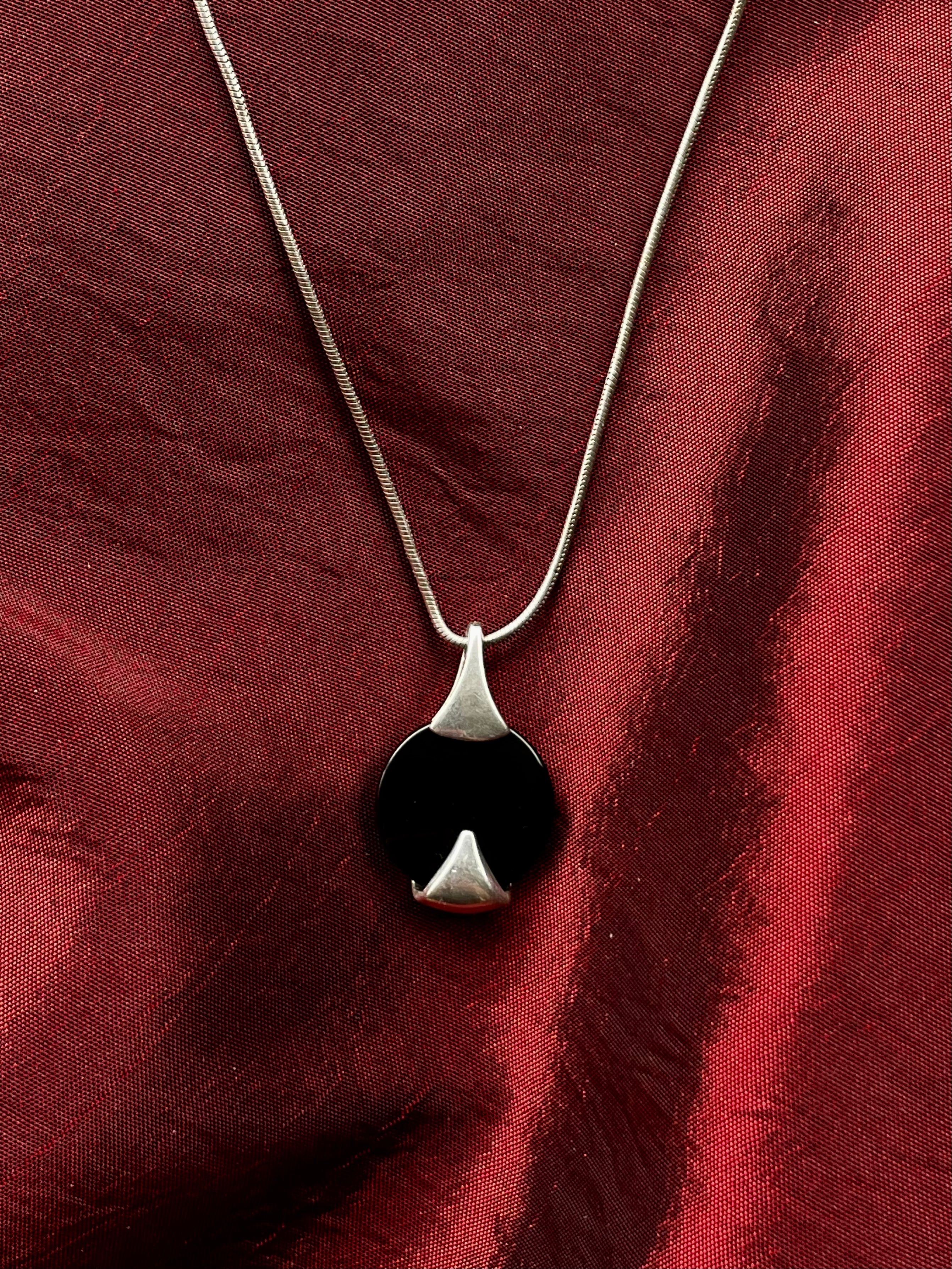 A bold black onyx disc is framed by two silver prongs in a form that feels both precis and instinctive. Brutalist in spirit, modernist in line.