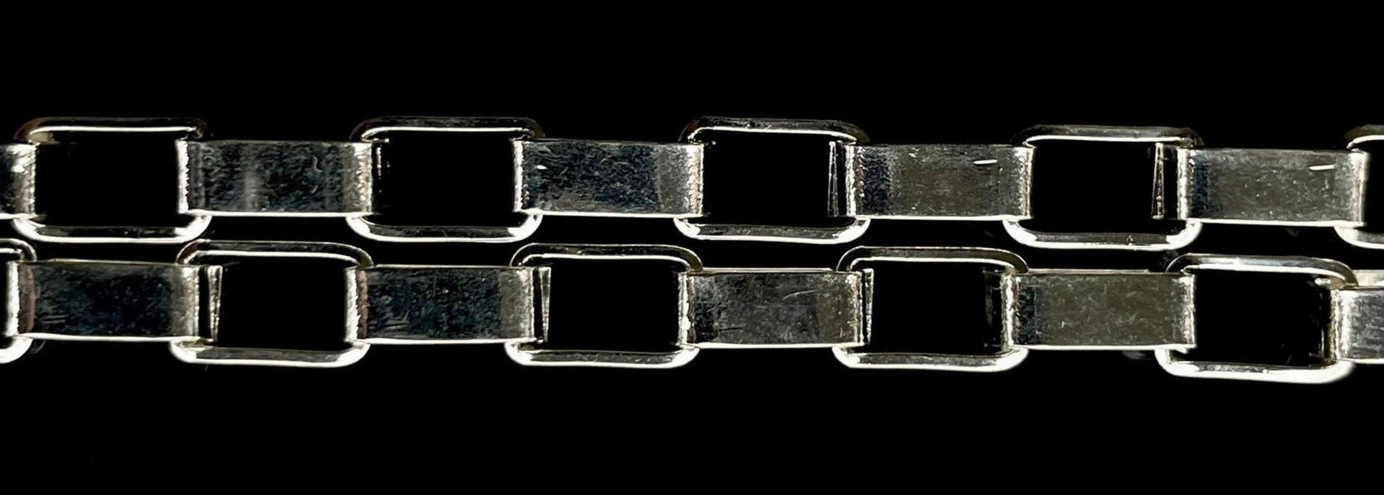 This vintage bracelet wraps the wrist in flat-edged sterling frames, each link resting with architectural precision. Light dances across its planes through the open centers, while a separate 925 charm tag confirms the metal’s purity | suggesting mid-late 20th-century Italian production, known for such minimalist hallmarking.