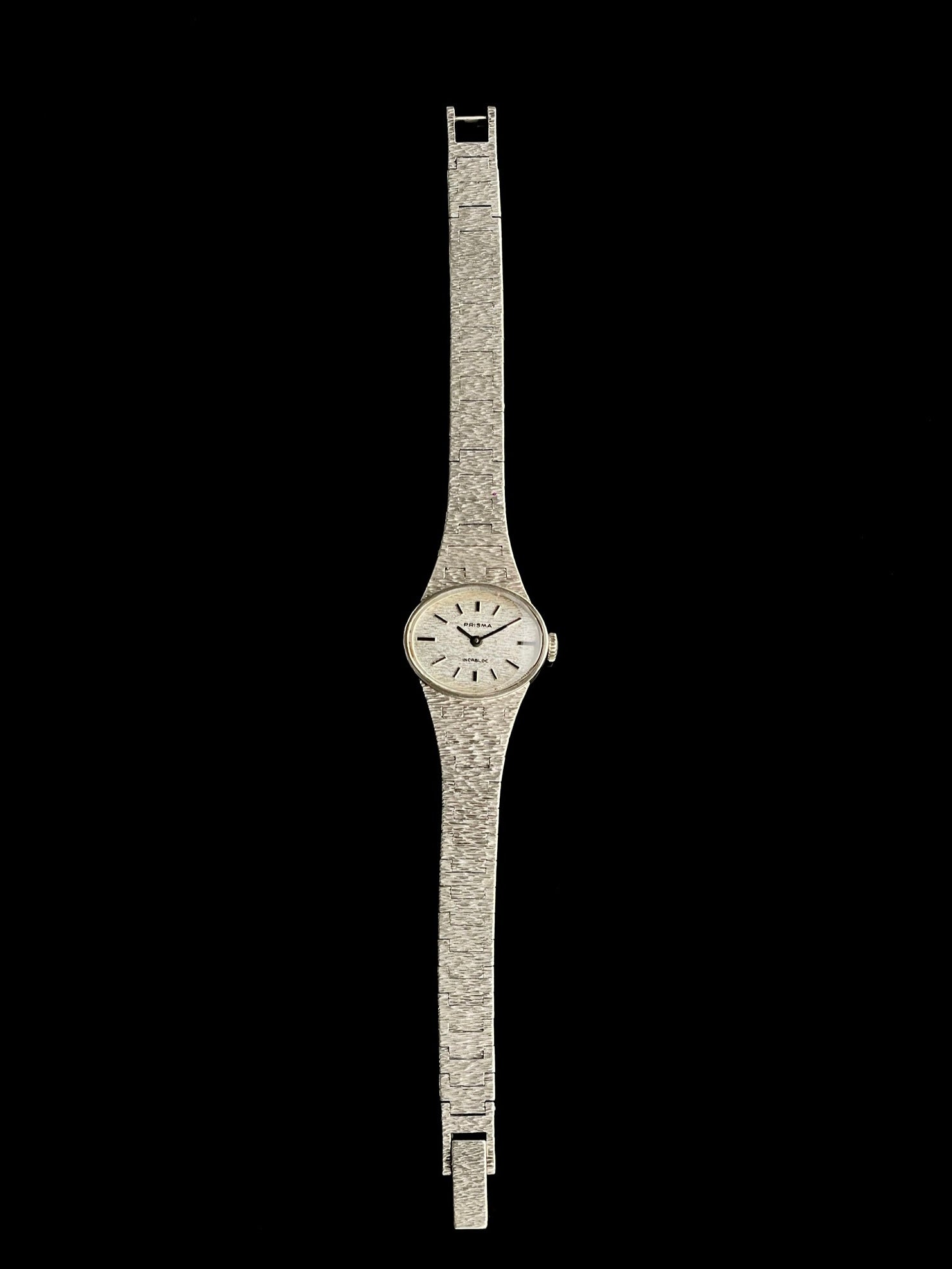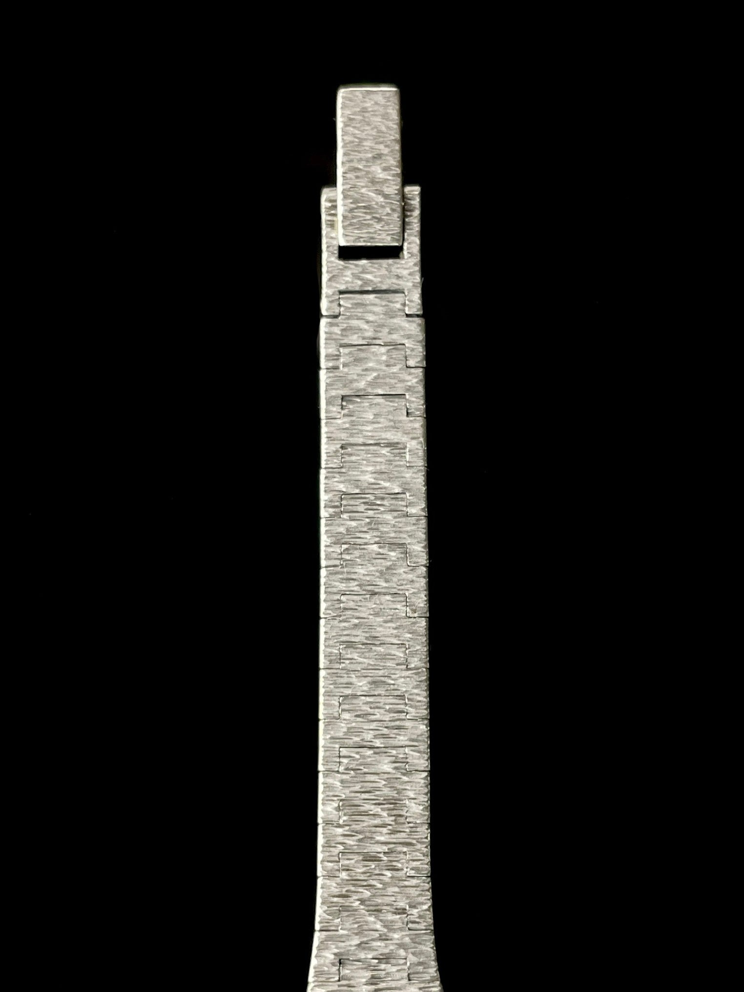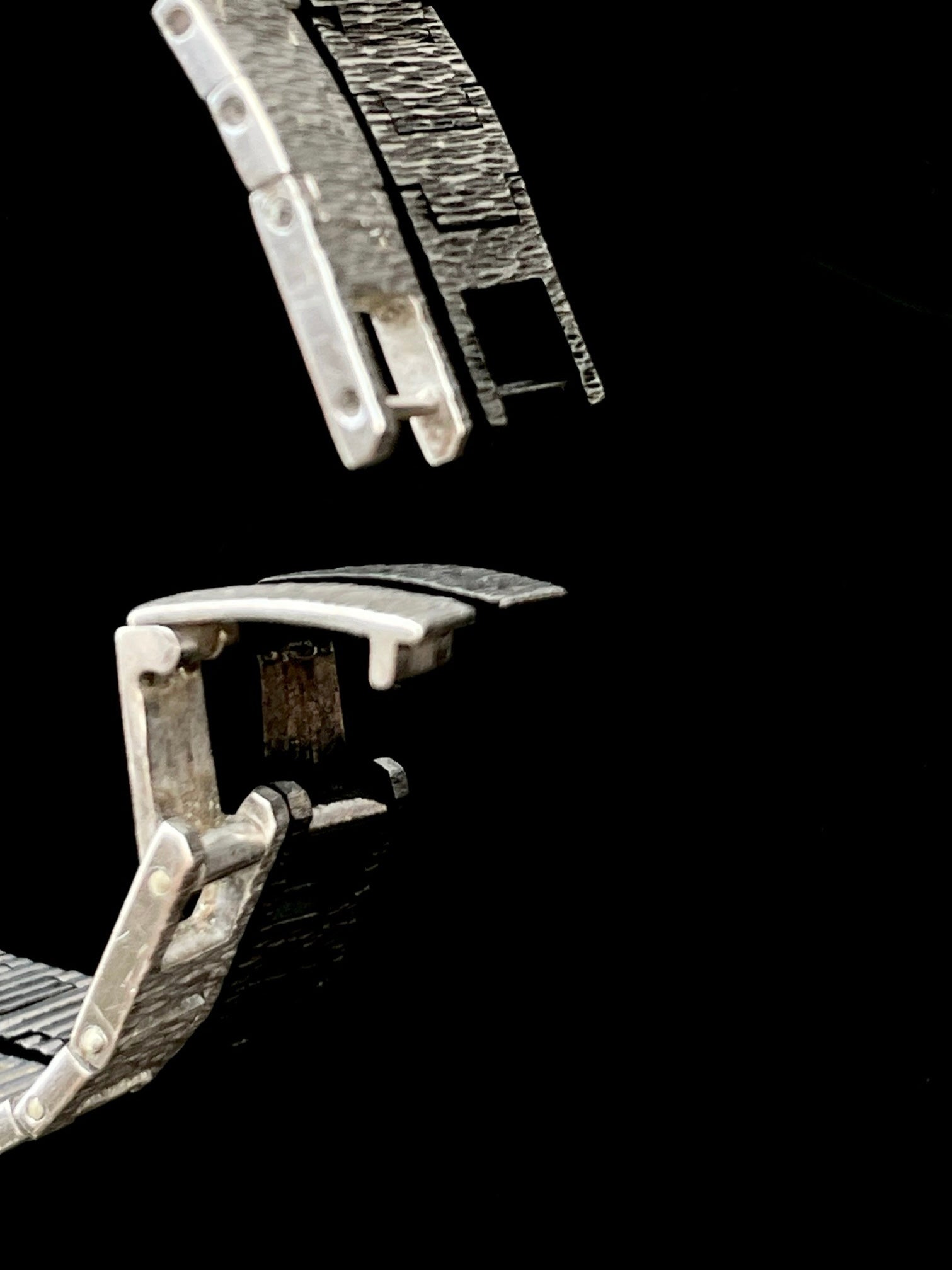 This vintage Prisma mini watch blends function with jewellery—the case and bracelet flowing seamlessly in a continuous, bark-textured sterling surface. The monochrome dial echoes the pattern, with minimal indices and slim hands for a clean, unified look.