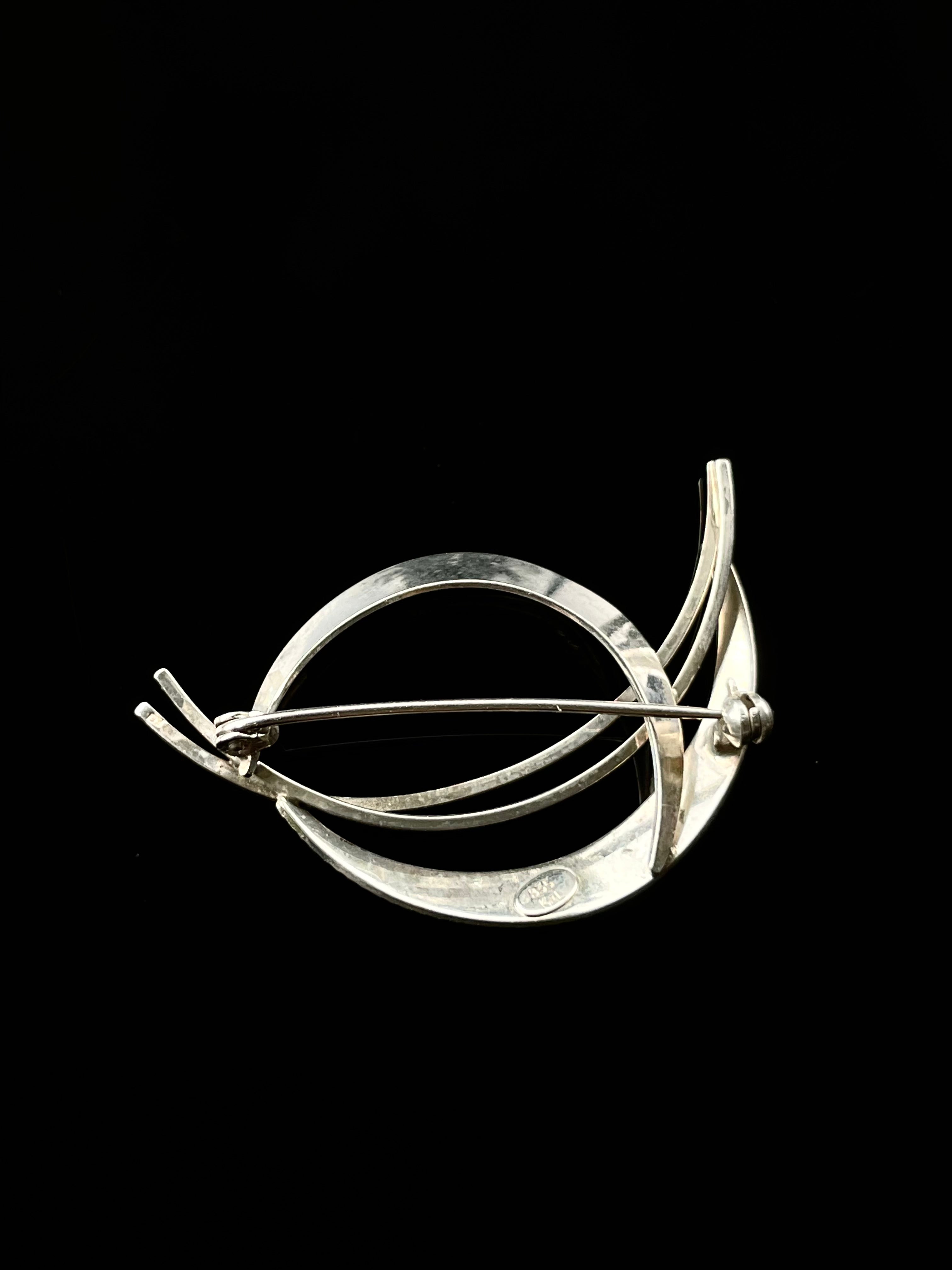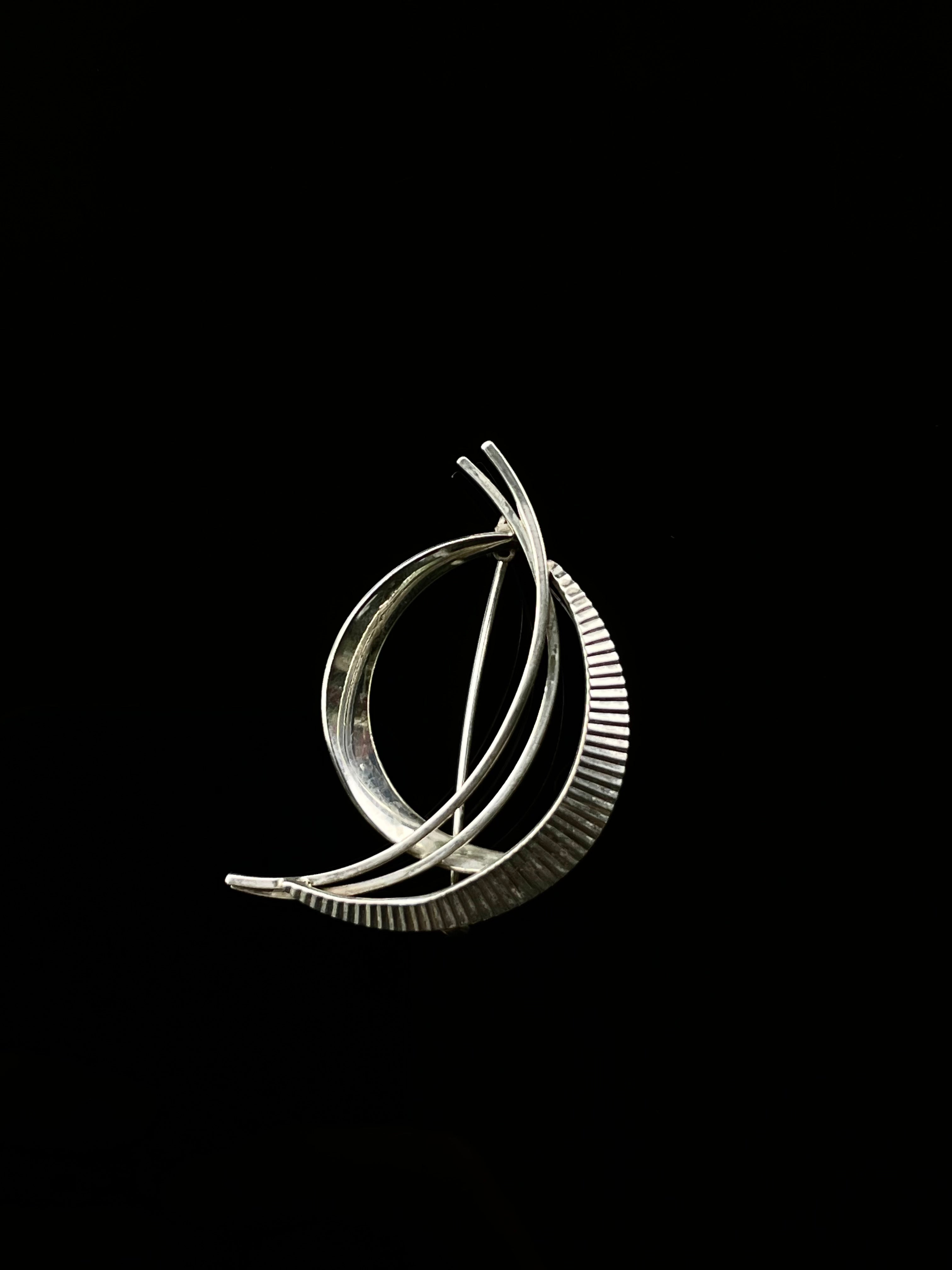A composition of arcs, tension, and stillness. This brooch by German maker Kordes & Lichtenfels distills the language of mid-century modernism into a fluid, sculptural form. The interplay between polished and fluted textures adds quiet depth, evoking the optimism and precision of its time.