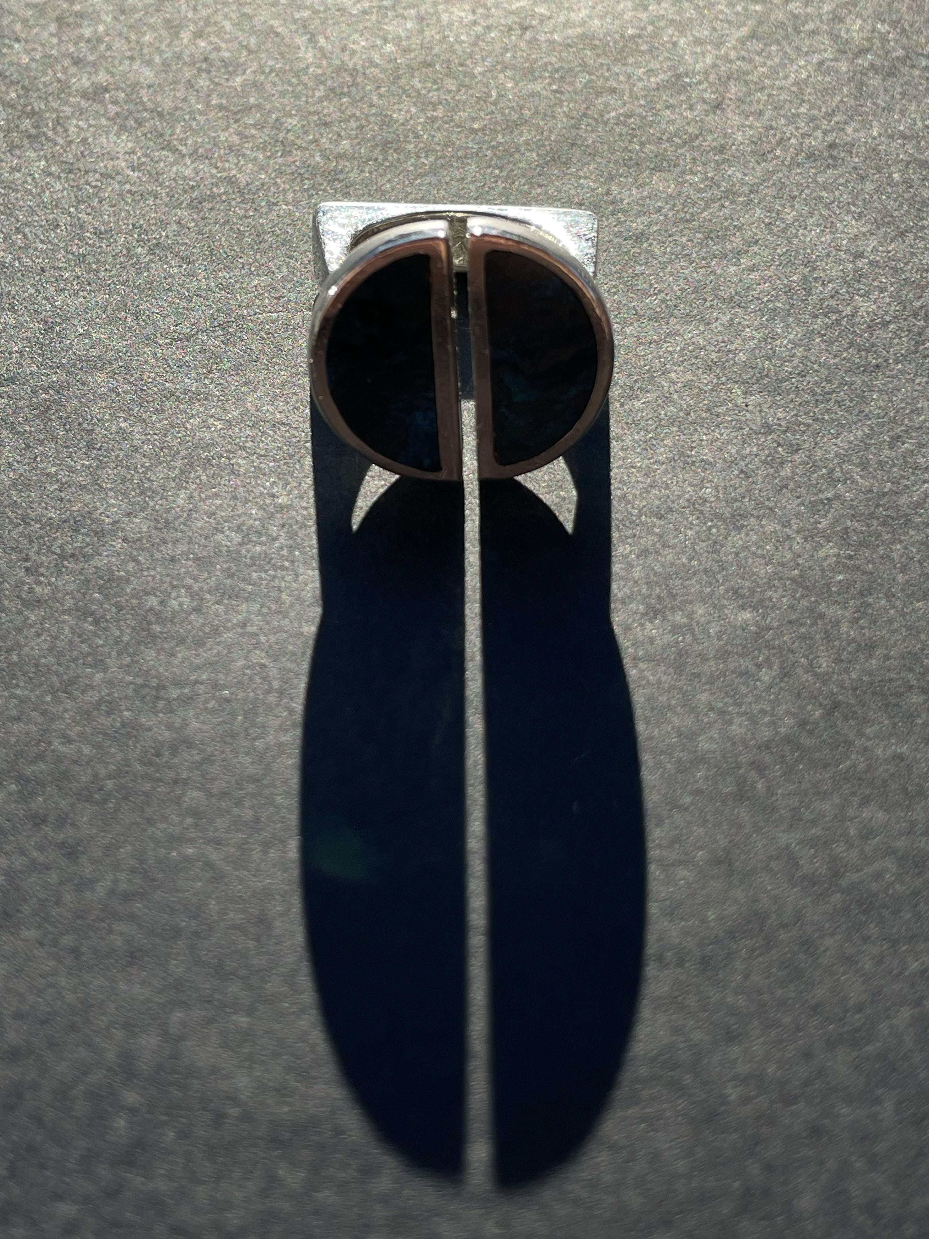 This vintage silver ring frames two panels of azurite in a perfect split—each side echoing the other, yet never quite the same. The stone's deep blues and greens are set within a clean, architectural bezel, mounted on a bold trapeze shank.